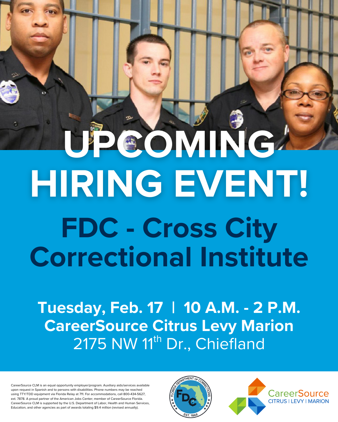 FDC Cross City Correctional Institite is hosting a hiring event on Tuesday, Feb. 17 from 10 a.m. - 2 p.m. at the CareerSource Citrus Levy Marion career center in Chiefland, located at 2175 NW 11th Dr.